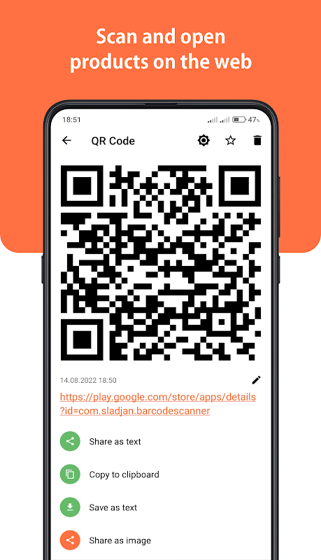 สแกนและอ่านโค้ด QR ทุกประเภทและโค้ด 2D อื่นๆ ได้อย่างง่ายดายด้วย CodeBot เครื่องสแกนจะจดจำประเภทรหัสโดยอัตโนมัติ คุณจึงไม่ต้องกังวลเกี่ยวกับรหัสดังกล่าว เครื่องสแกน QR จะจดจำเนื้อหาของโค้ด ไม่ว่าจะเป็นลิงก์ URL การเชื่อมต่อ WiFi ตำแหน่ง ใบเสร็จหรือคูปอง และช่วยคุณเปิดหรือแลกเนื้อหาที่สแกน QR & Barcode Scanner อ่านรูปแบบบาร์โค้ดทั้งหมดจากกล้องด้านหน้าหรือด้านหลัง แต่ยังอ่านภาพจากแกลเลอรี ค้นหาเนื้อหาโค้ดบนเว็บ แชร์หรือบันทึกเป็นข้อความหรือรูปภาพบนอุปกรณ์ของคุณ ส่งออกเป็นเอกสาร PDF หรือเพียงแค่พิมพ์