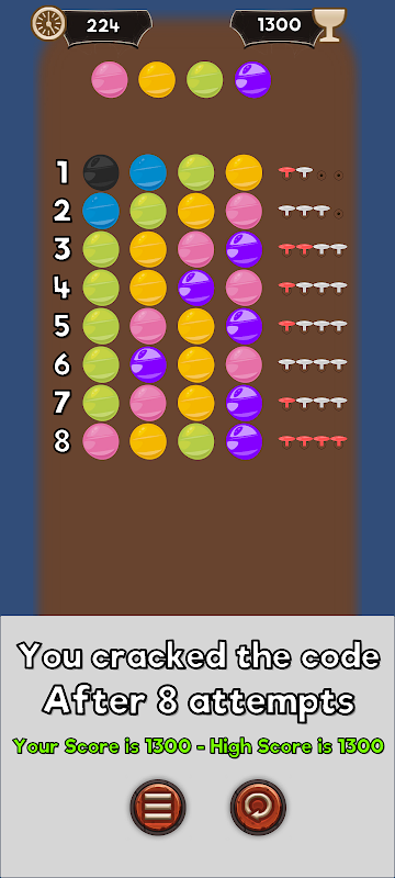 In the spirit of the classic game from the 1970's, in CodeBreaker, the goal is to figure out the hidden color code. Depending on your difficulty setting, the code can be either 4 or 5 colors.