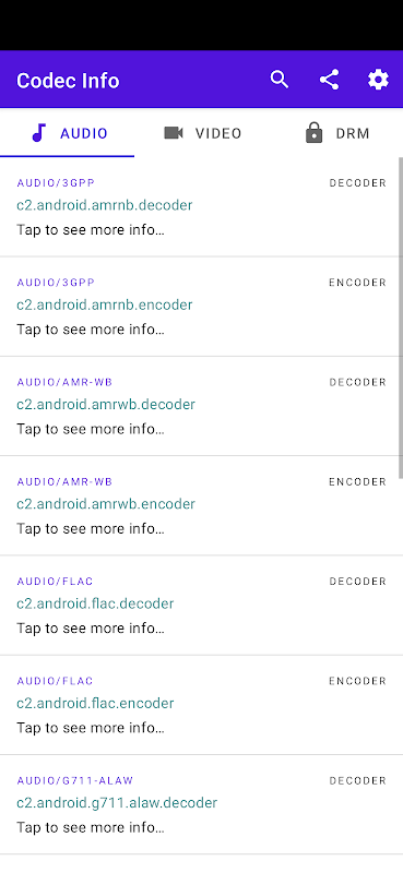Codec Info เป็นเครื่องมือง่ายๆ สำหรับนักพัฒนาที่แสดงรายการรายละเอียดของตัวเข้ารหัส/ตัวถอดรหัสมัลติมีเดีย (ตัวแปลงสัญญาณ) และประเภท DRM ที่มีอยู่ในอุปกรณ์ Android ของคุณ