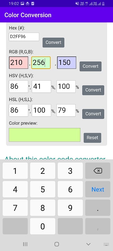 หนึ่งในแอพที่ง่ายที่สุดสำหรับการแปลงสีอยู่ที่นี่ แอพตัวแปลงสีนี้ส่งคืนหน่วยสีที่ถูกต้องตามอินพุต นอกจากนั้น เรายังสามารถตรวจสอบสีที่สร้างขึ้นในส่วนการแสดงตัวอย่างสี