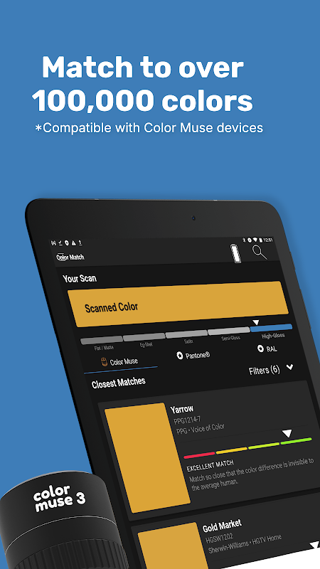 หลังจากเชื่อมต่ออุปกรณ์ Color Muse, Color Muse SE, Color Muse 2 หรือ Color Muse 3 แบบไร้สายแล้ว แอป Color Muse จะช่วยปรับกระบวนการเลือกสีของคุณให้คล่องตัวขึ้น เพื่อให้การจับคู่สีรวดเร็วและมั่นใจมากขึ้น ไม่ต้องยุ่งยากกับชุดพัดลม ชิปสี หรือตัวอย่างสีอีกต่อไป สแกนสีและค้นหาผลิตภัณฑ์ที่ตรงกัน ประสานกัน และเสริมกัน