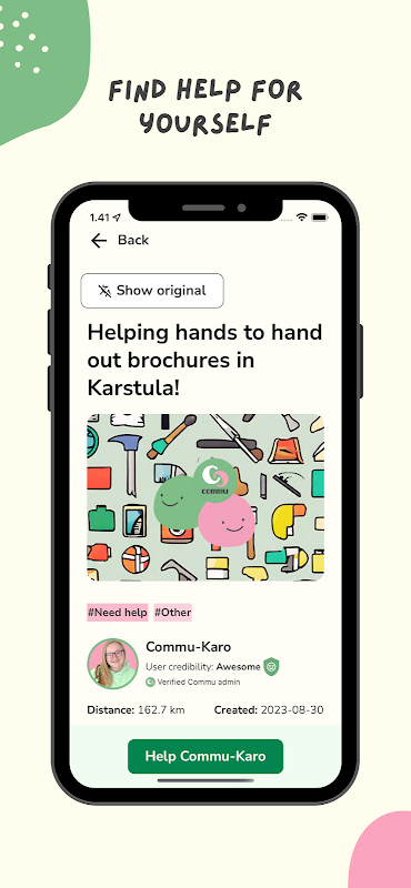 Commu สร้างขึ้นโดยผู้ประกอบการรุ่นเยาว์ชาวฟินแลนด์ เรามีภารกิจลดเกณฑ์การขอความช่วยเหลือและให้ความช่วยเหลือ เราเปิดตัวแอปในเดือนพฤษภาคม 2021 และปรับปรุงอย่างต่อเนื่องตามความคิดเห็นของผู้ใช้ หากคุณสังเกตเห็นข้อบกพร่องหรือต้องการแสดงความคิดเห็น คุณสามารถส่งข้อความถึงเราภายใน Commu หรือทางอีเมล [email protected]