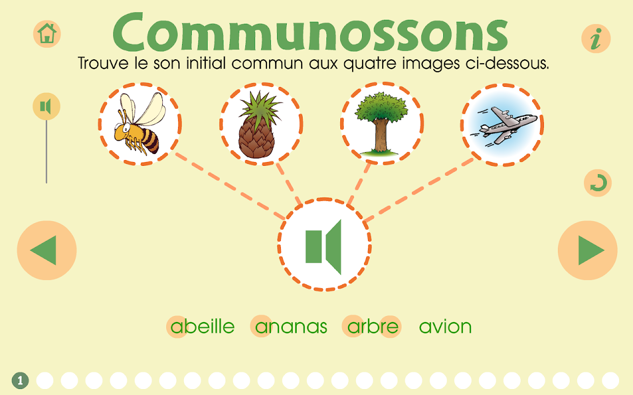 แอ็พพลิเคชันประกอบด้วยแบบฝึกหัด 25 แบบที่สร้างขึ้นในแบบเดียวกัน ในเกมนี้ผู้ใช้ต้องรู้จักเสียงเริ่มต้นของแต่ละคำแล้วแยกออกจากจิตใจ หลังจากได้ยินคำแต่ละคำโดยสัมผัสพวกเขาเขาเลือกที่ของไอคอนเสียงที่สอดคล้องกับพยางค์แรกของคำ จากนั้นเขาจะเลื่อนไอคอนคำตอบที่ถูกต้องลงในวงกลมสีขาว ในกรณีที่มีข้อผิดพลาดสัญญาณลบจะปรากฏขึ้น ถ้าเสียงเป็นที่ต้องการระฆังจบการออกกำลังกาย จากนั้นเราจะไปยังการออกกำลังกายครั้งต่อไป เพื่อความเพลิดเพลินมากขึ้นขอแนะนำให้ทำเกมนี้ด้วยหูฟังและสไตลัส