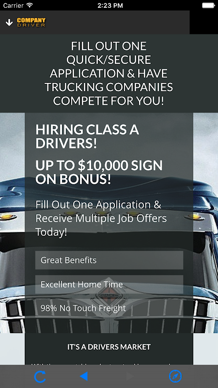 COMPANY DRIVER JOBS! Welcome to the first mobile app designed specifically for company drivers! Instantly have access to some of the highest paying job opportunities in the country by clicking on the "JOBS" icon. Want to apply to companies across the country all at once? Simply click on "Quick App" and submit your application and we'll match you with carriers who are hiring drivers like you today!