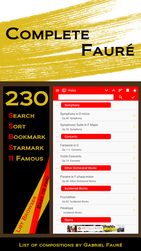This application is a list type browser application that introduces 230 works of Fauré to you.