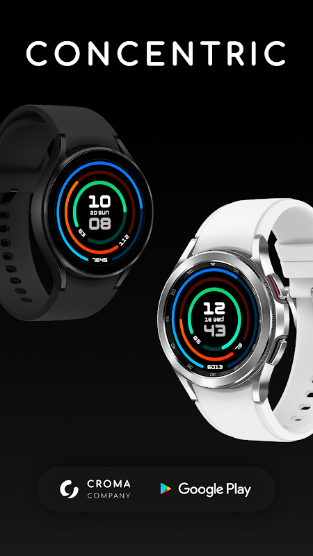 Concentric เป็นหน้าปัดนาฬิกาดิจิทัลสำหรับ Wear OS ที่ตรงกลางแสดงเวลาในรูปแบบ 12 ชั่วโมงหรือ 24 ชั่วโมง และระหว่างชั่วโมงและนาทีจะแสดงวันที่เสมอ นิวเคลียสล้อมรอบด้วยแท่งวงกลมสามแท่ง สีเขียวด้านในแสดงเปอร์เซ็นต์แบตเตอรี่ สีแดงแสดงค่าการเต้นของหัวใจ และสุดท้ายแสดงจำนวนก้าวในแต่ละวัน การแตะที่วันที่ปฏิทินจะเปิดขึ้น การแตะที่ค่าระดับแบตเตอรี่จะเป็นการเปิดเมนูที่เกี่ยวข้อง ในขณะที่อยู่เหนือค่าของขั้นตอนจะมีทางลัดที่ปรับแต่งได้ ในส่วนที่เกี่ยวกับการเต้นของหัวใจ โปรดดูหมายเหตุด้านล่าง