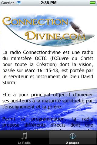 La radio Connectiondivine est une radio du ministère OCTC (l’Œuvre du Christ pour toute la Création) dont la vision, basée sur Marc 16 :15-18, est portée par le serviteur et instrument de Dieu David Storm.