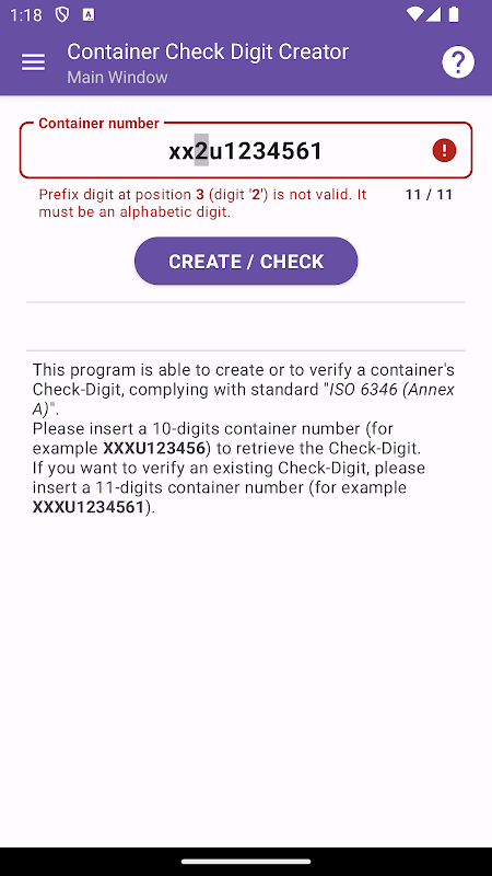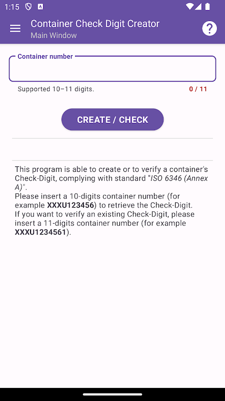 แอพนี้สามารถสร้างหรือตรวจสอบ Check-Digit ของคอนเทนเนอร์ได้ตามมาตรฐาน ISO 6346 (ภาคผนวก A)