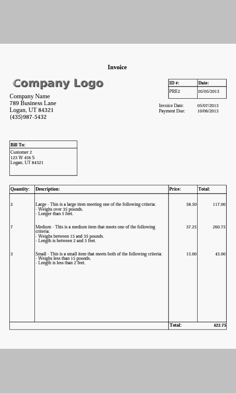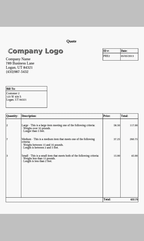 ลูกค้าของคุณจะมีความสุขมากเช่นกัน ไม่เพียง แต่พวกเขาจะสามารถที่จะได้รับใบเสนอราคาและใบแจ้งหนี้ผ่านทางอีเมล์ก่อนที่คุณจะออกจากเว็บไซต์ของงาน แต่พวกเขาจะได้รับการอ้าง / ใบแจ้งหนี้ในรูปแบบ PDF รูปแบบไฟล์ PDF จะมีข้อมูลรายชื่อผู้ติดต่อ บริษัท ของคุณเช่นเดียวกับข้อมูลลูกค้า ไฟล์ที่มีความคล้ายคลึงกับสิ่งที่คุณจะได้เห็นในการใช้งานหลายใบแจ้งหนี้