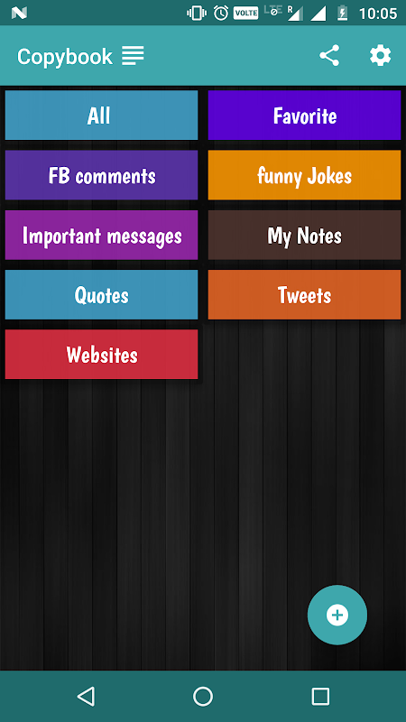 Copybook ช่วยในการบันทึกความคิดเห็น, ทวีต, ลิงก์เว็บไซต์, หมายเหตุ, เรื่องตลก ฯลฯ ที่ชื่นชอบของผู้อื่นเพียงคัดลอกข้อความจากแอปพลิเคชันใด ๆ และบันทึกในชื่อหมวดหมู่ส่วนบุคคล