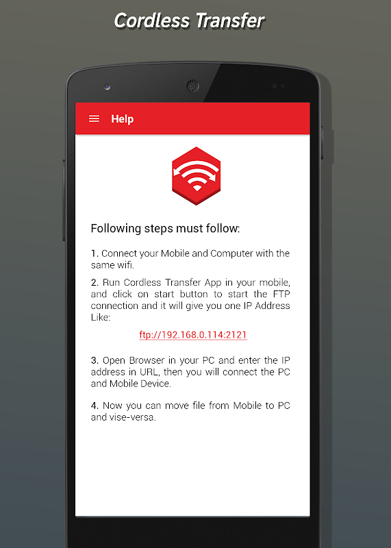 ไร้สายทำให้การถ่ายโอนโทรศัพท์ Android ของคุณ / Pad เป็นเซิร์ฟเวอร์ FTP ไร้สาย เพื่อให้คุณสามารถคัดลอกไฟล์หลายโฟลเดอร์หรือฮาร์ดไดรฟ์ทั้งหมดไปยังโทรศัพท์หรือรอง-a-ในทางกลับกันของคุณ ลืมสาย USB ของคุณเพียงจำไร้สายถ่ายโอนเพราะมันสามารถทำงานเดียวกัน