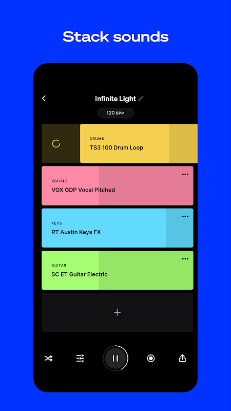 สร้างสแต็กโดยเลือกสไตล์ จากนั้นเพิ่มเลเยอร์เครื่องดนตรีได้สูงสุดแปดเลเยอร์จากแคตตาล็อก Splice ทุกการเลือกเป็นของคุณโดยเฉพาะและถูกกำหนดให้ทำงาน