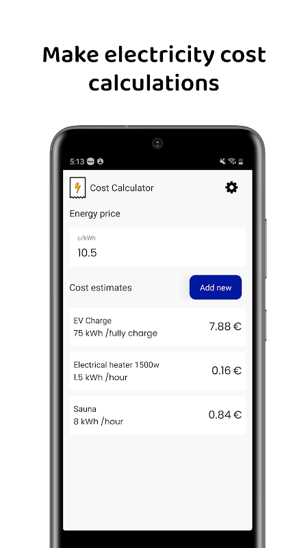 CostAware is a quick and simple electricity cost calculator for calculating electric costs of using home appliances and others. Your list of appliances will be stored on the app and you can quickly check usage cost according to todays electricity unit price (kWh).