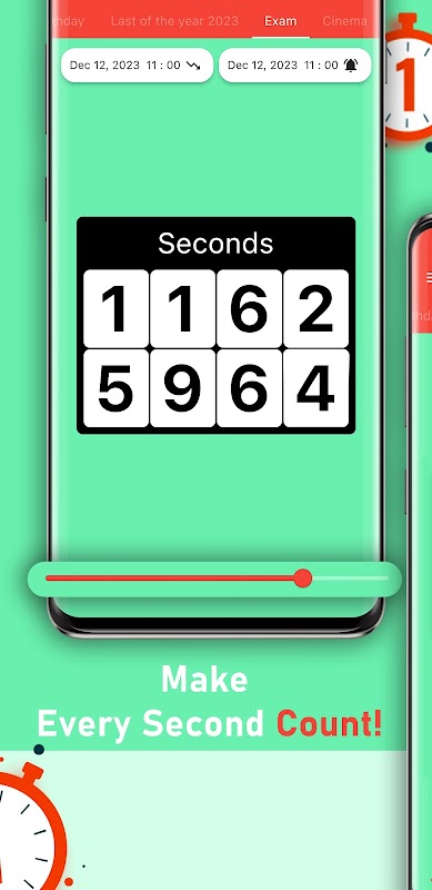 ตัวจับเวลานับถอยหลังไม่เพียงแต่นับถอยหลังสู่วันสำคัญเท่านั้น แต่ยังรวบรวมอดีตด้วยคุณสมบัติการนับถอยหลังที่ไม่เหมือนใคร หลังจากการนับถอยหลังสิ้นสุดลง ตัวจับเวลาจะเปลี่ยนเข้าสู่โหมดนับถอยหลังอย่างราบรื่น ช่วยให้คุณชื่นชมเวลาที่ผ่านไปนับตั้งแต่วันที่ระบุ