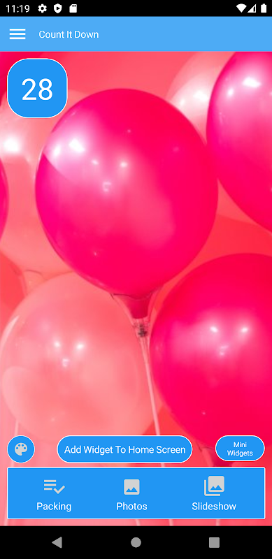 Count It Down เสนอวิดเจ็ตการนับถอยหลังเพื่อวางบนหน้าจอหลักของโทรศัพท์ของคุณ นอกจากนี้ วิดเจ็ตการนับถอยหลังยังมีสไลด์โชว์ภาพถ่าย คุณสามารถเลือกจากรูปภาพที่โหลดไว้ล่วงหน้าของเรา หรือคุณจะอัปโหลดรูปภาพของคุณเองก็ได้ แอปนับถอยหลังของเรายังมีรายการบรรจุภัณฑ์ที่ปรับแต่งได้ เพื่อให้คุณสามารถเก็บรายการสิ่งของทั้งหมดที่คุณต้องการจดจำไว้ใช้ในกิจกรรมของคุณ