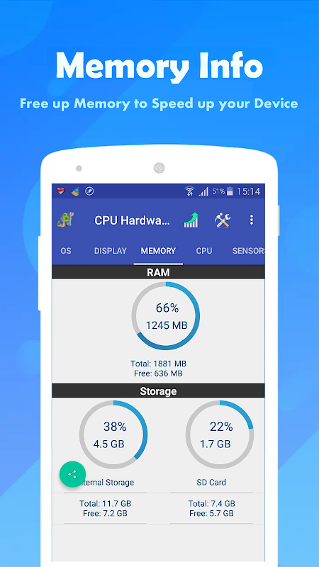 – Memory: Total and available RAM, as well as Storage information about your device.
