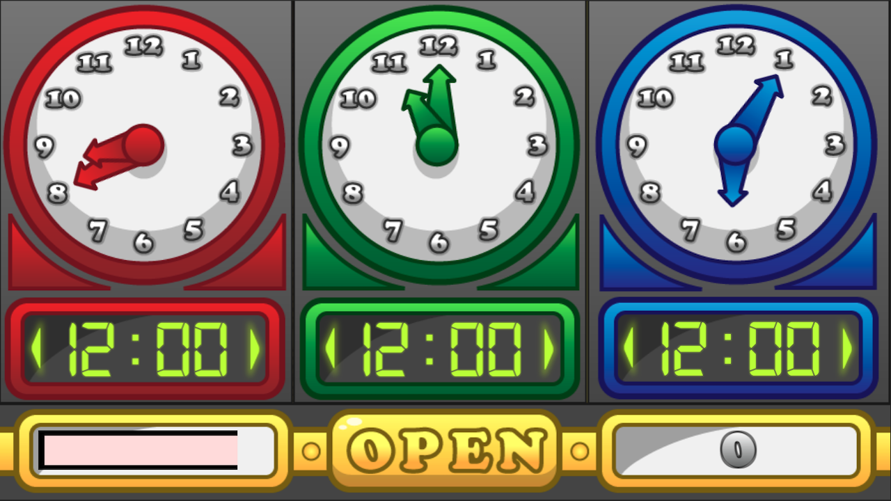 Time locked vaults are the latest rage in treasure security. They can only be opened by matching the time ‘codes’ of both the analogue and digital clock locks. You need to try and open as many of these vaults a possible within a given time limit. How much gold can you collect?