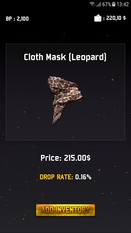 Crate Simulator for PUBG contains all the available clothes crates from the real game: FEVER, MILITIA, DESPERADO, BIKER, SURVIVOR, WANDERER, GAMESCOM, TRIUMPH, RAIDER and EQUINOX. In this simulator, all of them are free to open and displays you the price of the dropped item and its drop rate!