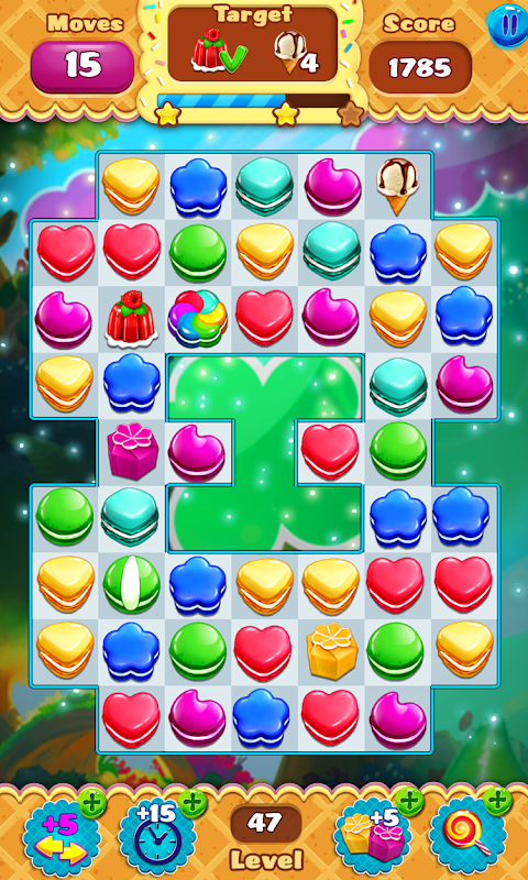 สิ่งที่คุณต้องทำคือจับคู่มาการอง 3 ชิ้นขึ้นไปในเกมเท่านั้น ยิ่งคุณจับคู่ได้มากเท่าไหร่ คุณก็จะยิ่งได้คะแนนมากขึ้นเท่านั้น โดยปกติแล้ว คุณจะต้องได้คะแนนที่กำหนด ดังนั้นพยายามจำไว้เสมอ