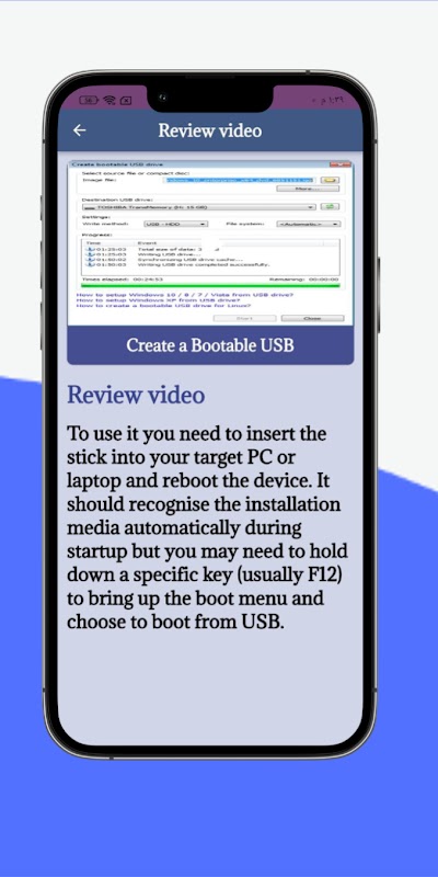 แอพนี้ให้คำแนะนำโดยละเอียดเกี่ยวกับวิธีการดาวน์โหลดและติดตั้งซอฟต์แวร์ที่จำเป็น วิธีเตรียมไดรฟ์ USB สำหรับใช้งาน และวิธีถ่ายโอนระบบปฏิบัติการหรือซอฟต์แวร์ไปยังไดรฟ์ USB