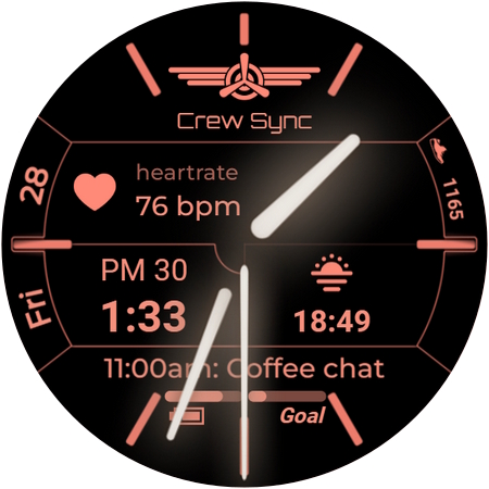 หน้าปัดนาฬิกานี้ออกแบบมาสำหรับแอป Crew Sync ซึ่งจะซิงค์ตารางเที่ยวบินของสมาชิกลูกเรือกับสมาร์ทวอทช์ Wear OS (เข้ากันได้กับ Netline/CrewLink) แต่ยังมีประโยชน์สำหรับการใช้งานในชีวิตประจำวันแม้ว่าคุณจะไม่ใช่ลูกเรือก็ตาม!