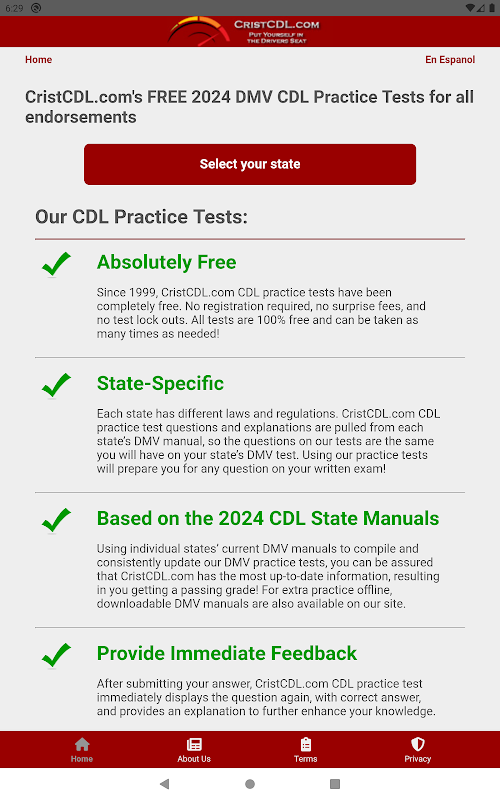 การทดสอบฝึกหัดของเราเป็นการทดสอบเฉพาะของรัฐและประกอบด้วยความรู้ทั่วไป เบรกลม การผสมผสาน เรือบรรทุก รถดับเบิ้ลและทริปเปิ้ล วัตถุอันตราย รถโรงเรียน ผู้โดยสาร และมีการทดสอบและวิดีโอสำหรับการตรวจสอบก่อนการเดินทาง การทดสอบแต่ละครั้งจะให้ผลตอบกลับทันทีสำหรับคำตอบของคุณ โดยจะแสดงว่าคุณตอบถูกหรือผิดพร้อมคำอธิบายสำหรับคำตอบที่ถูกต้อง และควรใช้ควบคู่กับคู่มือสถานะปัจจุบันของคุณที่เรารวมไว้ในแอปสำหรับดาวน์โหลด