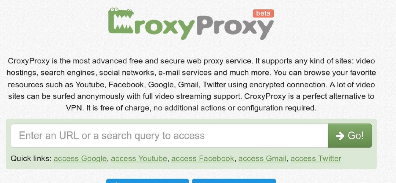 CroxyProxy is the most advanced free and secure web proxy service. It supports any kind of sites: video hostings, search engines, social networks, e-mail services and much more. You can browse your favorite resources such as Facebook, Google, Gmail, Twitter and also have Youtube unblocked using encrypted connection.
