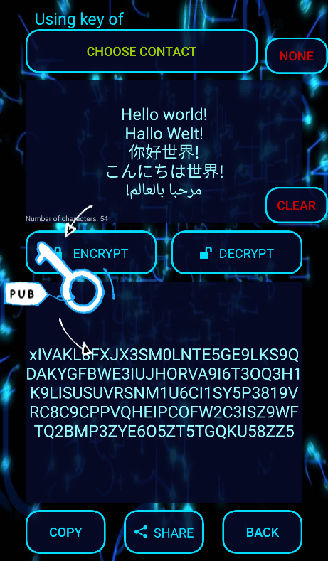 - When not choosing a contact encrypt and decrypt messages with a simple text converter on base 36