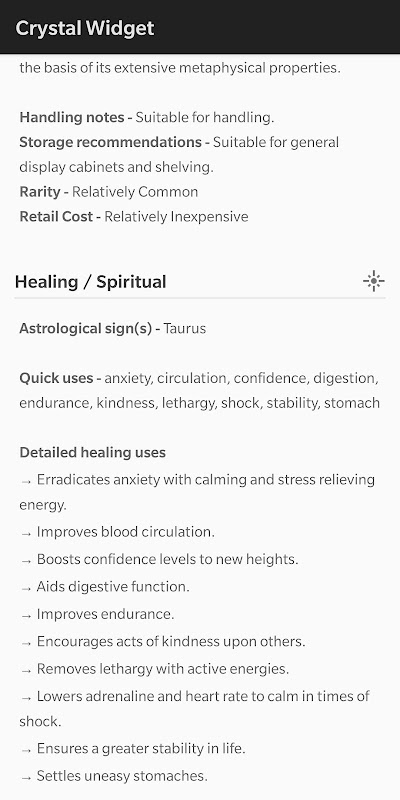 ชุดวิดเจ็ตง่ายๆ ที่แสดงภาพคริสตัลที่สวยงาม (ในโหมดรายวันและ/หรือรายชั่วโมง) คริสตัลทุกเม็ดประกอบด้วยข้อเท็จจริงที่มีรายละเอียดสูง ข้อมูลทางธรณีวิทยาและการรักษาคริสตัล ข้อมูลจิตวิญญาณ ตัวเลข ยาอายุวัฒนะ และจักระ