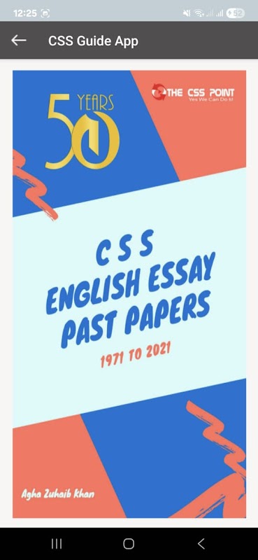 แอป CSS-Guide สร้างขึ้นบนระบบปฏิบัติการ Android เป็นเวอร์ชันแรกสำหรับผู้สมัครทุกคน ครอบคลุมรายละเอียดวิชาบังคับและวิชาเลือก รวมถึงเนื้อหาหลักสูตรทั้งหมด ทุกคนสามารถดาวน์โหลดได้จาก Google Play Store แอปนี้เป็นแอปออฟไลน์ทั้งหมดและไม่จำเป็นต้องได้รับอนุญาตจากโทรศัพท์ของคุณ แอปนี้พัฒนาโดย ZH Softs จุดประสงค์คือเพื่ออำนวยความสะดวกให้กับผู้สมัคร CSP ทั่วโลก ด้วยแอปที่ใช้งานง่าย ประกอบด้วยบันทึกย่อและบันทึกย่อแบบสั้นและยาวสำหรับทุกวิชาในรูปแบบ PDF ที่คุณสามารถอ่านสไลด์ทั้งหมดได้อย่างง่ายดาย