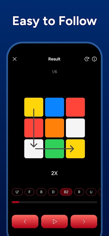 เลือกแต่ละหน้าโดยตรงในแอปโดยใช้ตัวเลือกสีที่ใช้งานง่าย โปรแกรมแก้ลูกบาศก์จะวิเคราะห์การจัดเรียงของคุณอย่างแม่นยำ ตรวจสอบว่าการจัดเรียงนั้นถูกต้อง และสร้างคำตอบที่สมบูรณ์ในไม่กี่วินาที ทุกขั้นตอนจะแสดงให้เห็นเป็นภาพ ทำให้กระบวนการง่ายต่อการติดตามสำหรับทั้งผู้เรียนใหม่และผู้เล่นที่มีประสบการณ์
