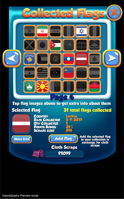 ธงที่รวบรวมได้จะถูกเก็บไว้ในคอลเลกชันธงของคุณและให้โบนัสกับคะแนนของคุณเมื่อคุณจับคู่ลูกบาศก์ที่มีธงเดียวกันกับที่คุณรวบรวมได้ ยิ่งคอลเลกชันของคุณเพิ่มขึ้นมากเท่าใด โบนัสคะแนนที่เป็นไปได้ก็จะยิ่งมากขึ้นเท่านั้น และคุณสามารถรวบรวมธงเดียวกันได้หลายอันเพื่อเพิ่มโบนัสของคุณ