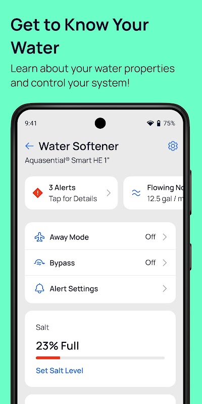 •การตรวจสอบระบบสดช่วยให้คุณสามารถดูกิจกรรมของระบบของคุณและดูว่าวันนี้ได้รับการบำบัดน้ำไปแล้วกี่แกลลอน