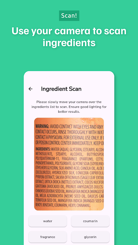 ใช้กล้องของคุณสแกนฉลากผลิตภัณฑ์โดยตรง และรับข้อมูลเชิงลึกเกี่ยวกับส่วนผสมได้ทันที