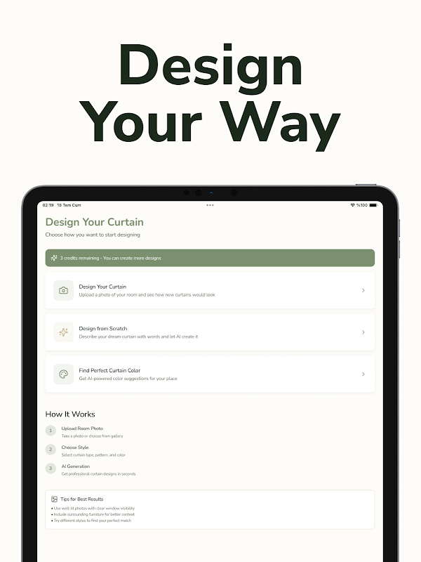 • ออกแบบตั้งแต่เริ่มต้น: อธิบายผ้าม่านในฝันของคุณ ไม่ว่าจะเป็นสไตล์โมเดิร์น หรูหรา มินิมอล โบฮีเมียน หรือสแกนดิเนเวีย แล้ว AI ของเราจะสร้างดีไซน์ที่ตรงใจคุณ