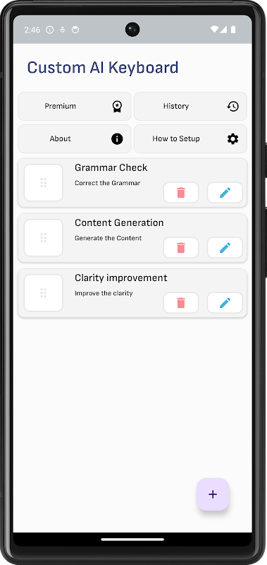 ขอแนะนำ Custom Keys Keyboard ที่ปฏิวัติวงการ เกตเวย์ที่ดีที่สุดของคุณสู่การโต้ตอบของ AI ที่ไร้รอยต่อและประสิทธิภาพการทำงานที่เหนือชั้น บอกลาการพิมพ์ที่น่าเบื่อและเปิดรับศักราชใหม่แห่งประสิทธิภาพด้วยเทคโนโลยีคีย์บอร์ดสุดล้ำของเรา ด้วยการเพิ่มขีดความสามารถให้คุณสร้างคีย์แบบกำหนดเองและกำหนดคำสั่ง AI เราได้ปฏิวัติวิธีที่คุณโต้ตอบกับเทคโนโลยี