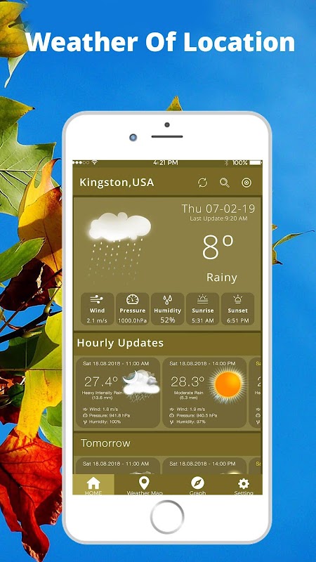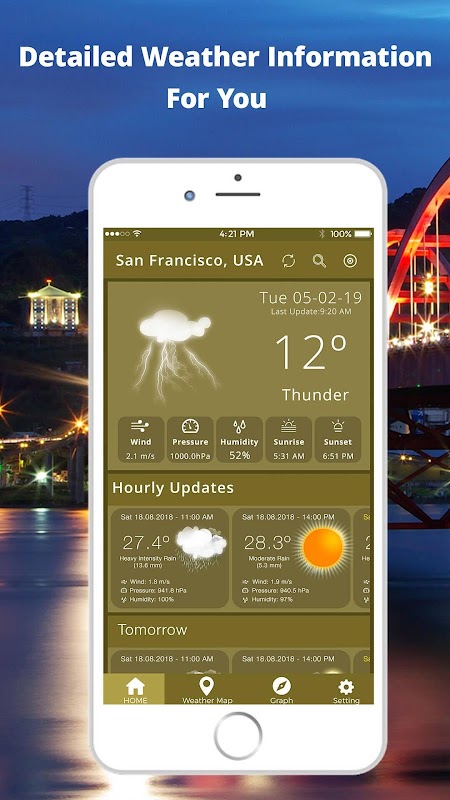 ☀️ This daily weather app weather tracker display current temperature, daily and hourly forecasts, sunrise and sunset time, humidity, wind speed and air pressure with weather today & weather tomorrow.