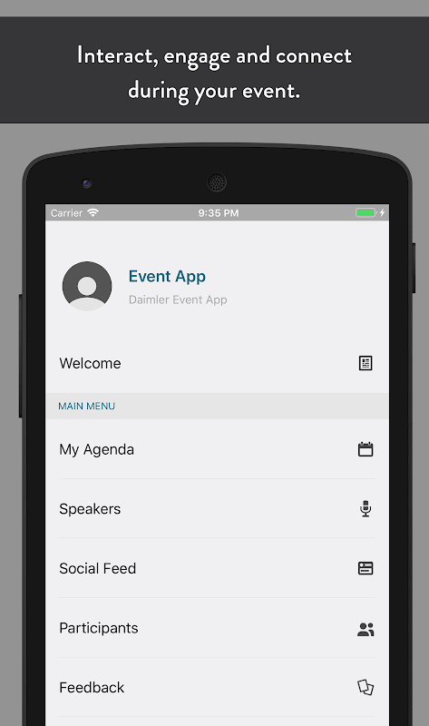 The Daimler Event App lets invited attendees submit questions, message other delegates and exchange digital business cards, schedule meetings, complete surveys, create personal agendas, study virtual libraries and meeting information, review case studies, browse speaker and attendee profiles, follow presentations, take notes, save items for after your event and much more.