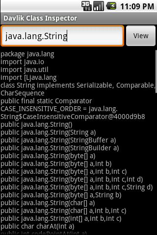 This app uses reflection to list all the members, methods and their modifiers and signatures of the given class name stored on the device.