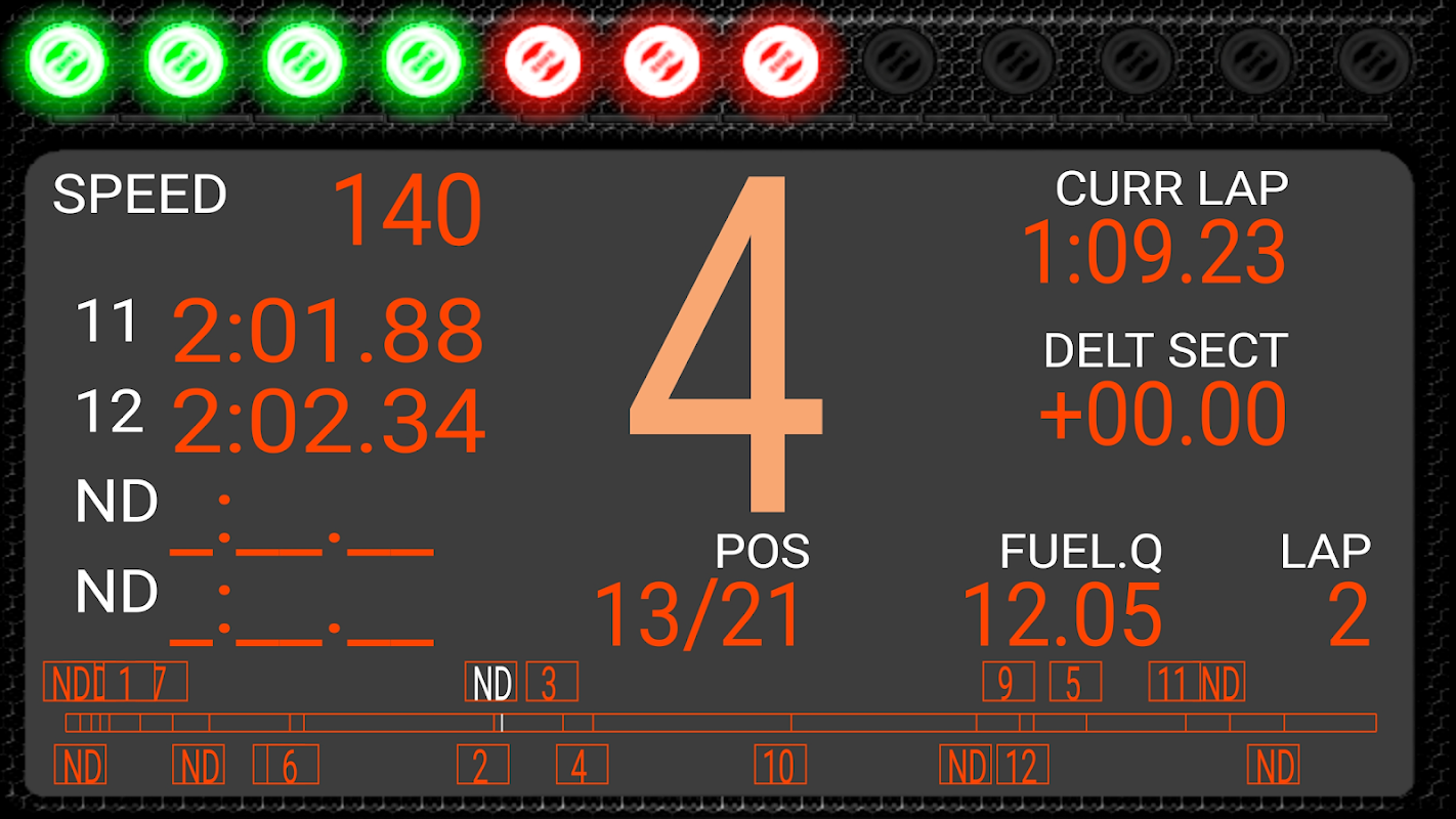 ตัวบ่งชี้เกียร์, RPM, ความเร็ว, ตำแหน่ง, เวลารอบที่ดีที่สุด / สุดท้าย, เวลาแบ่งตัวเอง, หมายเลขรอบ, อุณหภูมิน้ำ / น้ำมัน, เชื้อเพลิง, นาฬิกา, มาตรวัด G-Force, ตัวบ่งชี้คันเร่ง / เบรก