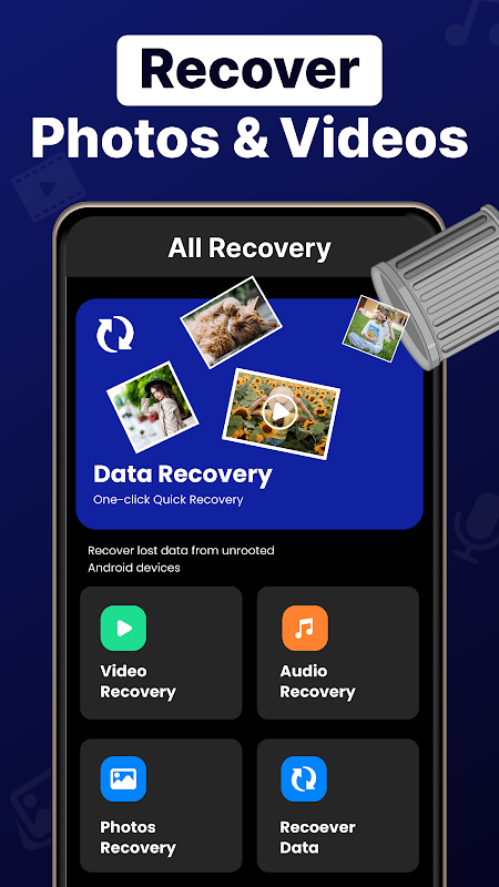 แอปกู้คืนไฟล์เป็นเครื่องมือกู้คืนข้อมูลที่มีประสิทธิภาพซึ่งสามารถช่วยคุณกู้คืนรูปภาพหรือวิดีโอที่สูญหายหรือถูกลบ มันทำงานเหมือนถังขยะรีไซเคิลสำหรับโทรศัพท์มือถือของคุณ ไฟล์ที่ถูกลบของคุณจะถูกบันทึกไว้ที่นั่น คุณสามารถกู้คืนไฟล์ที่ถูกลบได้ในคลิกเดียว พูดง่ายๆ ก็คือ แอปนี้จะสำรองข้อมูลที่คุณเพิ่งลบไปโดยอัตโนมัติ และช่วยให้คุณสามารถยกเลิกการลบไฟล์ได้
