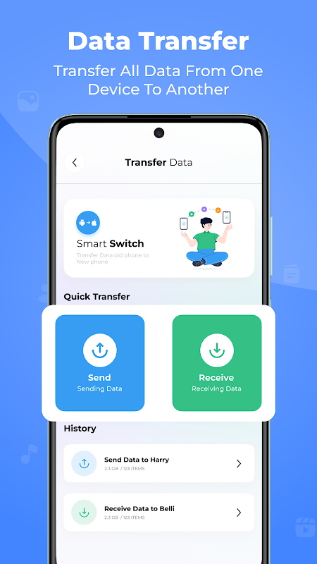 Phone clone data transfer app utilizes all types of file formats. Smart Phone transfer app backup all the content of Android. Fast phone clone- a data sharing app is beneficial to copy my data content transfer app that moves all the data from one device to another. Using a smart Data transfer simplifies the process of transferring data from one device to another. You can use the Transfer My Data app for easy transfer between smart phones. Effortlessly transfer all data to your device with the Smart Data Transfer- phone clone app.