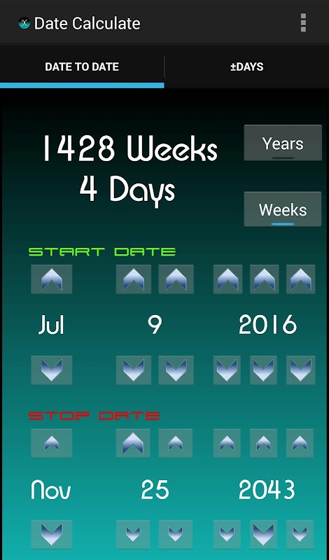 Date Calculate lets you quickly enter a start and stop date and the app calculates the number of days, weeks, or years in between!