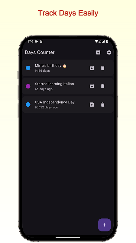 ด้วยตัวนับวัน การติดตามวันที่สำคัญของคุณไม่เคยง่ายอย่างนี้มาก่อน ไม่ว่าจะเป็นการนับถอยหลังส่วนตัวหรืออ้างอิงทางประวัติศาสตร์ แอปนี้ถูกออกแบบมาเพื่อทำให้ทุกอย่างราบรื่น เริ่มติดตามวันที่สำคัญของคุณวันนี้เลย!