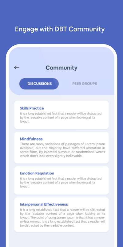 เครื่องมือของชุมชน เช่น Discussion Groups และ Peer Support Groups ช่วยให้คุณฝึกฝนและแบ่งปันความรู้เกี่ยวกับทักษะ DBT