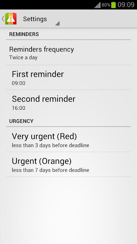 Deadlines Reminder is really simple and very intuitive. You don't have to reset reminders over and over again. You will be automatically notified about upcoming deadlines every day. Of course you can set reminders frequency and times so you will be informed when you want and as much as you want. This app can be also used as deadline countdown.