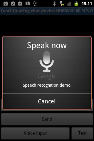 แอปพลิเคชันนี้ช่วยให้ผู้ที่ได้ยินสามารถพิมพ์ข้อความบนแป้นพิมพ์เสมือนหรือใช้การป้อนข้อมูลด้วยเสียง (ปุ่ม "ป้อนข้อมูลด้วยเสียง" หรือปุ่ม "พูดและส่ง") คุณต้องมีอินเทอร์เน็ตสำหรับการป้อนข้อมูลด้วยเสียง หากต้องการส่งข้อความไปยังอุปกรณ์ตัวที่สองคุณควรกดปุ่ม "ส่ง" ข้อความที่ได้รับจากอุปกรณ์เครื่องที่สองจะแสดงขึ้นบนหน้าจอ
