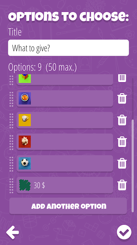 รูเล็ตการตัดสินใจช่วยให้คุณเลือกระหว่างตัวเลือกต่างๆที่พร้อมใช้งาน คุณสามารถเขียน 2 ถึง 50 ตัวเลือกใน roulettes ที่แตกต่างกันและใช้พวกเขาเมื่อใดก็ตามที่คุณต้องการ นอกจากนี้คุณยังสามารถเพิ่มภาพลงในแต่ละตัวเลือก ภาพต้องเป็น png / jpg และต้องเก็บไว้ในโทรศัพท์ของคุณ ข้อมูลจะถูกบันทึกไว้ในอุปกรณ์เท่านั้นไม่ใช่ในระบบคลาวด์