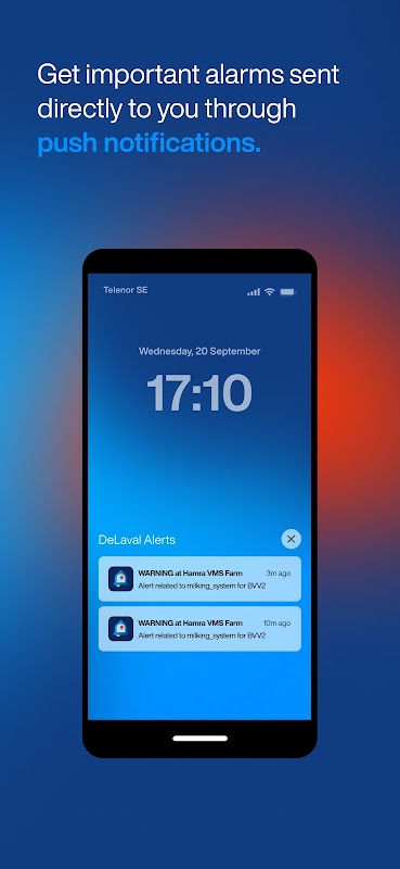 รับการแจ้งเตือนเมื่อสถานการณ์ต้องได้รับการดูแลที่ฟาร์มของคุณ เมื่อคุณมีบัญชี DeLaval Plus และเชื่อมต่อระบบ DeLaval ที่รองรับแล้ว แอพมือถือนี้จะเป็นสิ่งที่ต้องมีในกล่องเครื่องมือของคุณ
