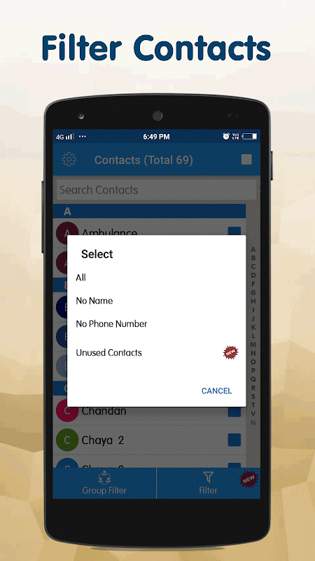 Allows you to filter your contacts by account type like gmail, phone, sim, etc. It also filters contacts without name or number. It also shows unused contacts, so user can know, which of the contacts not required and delete them.